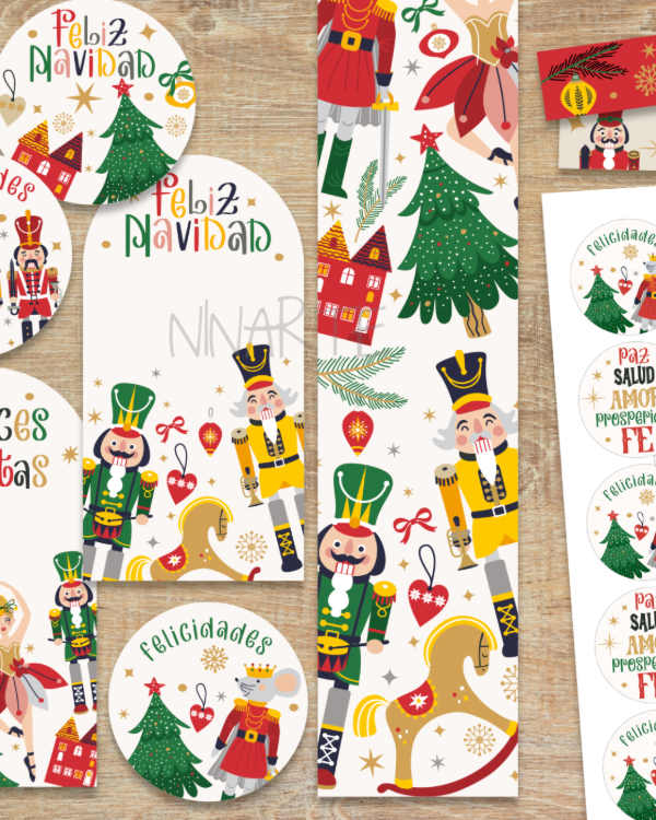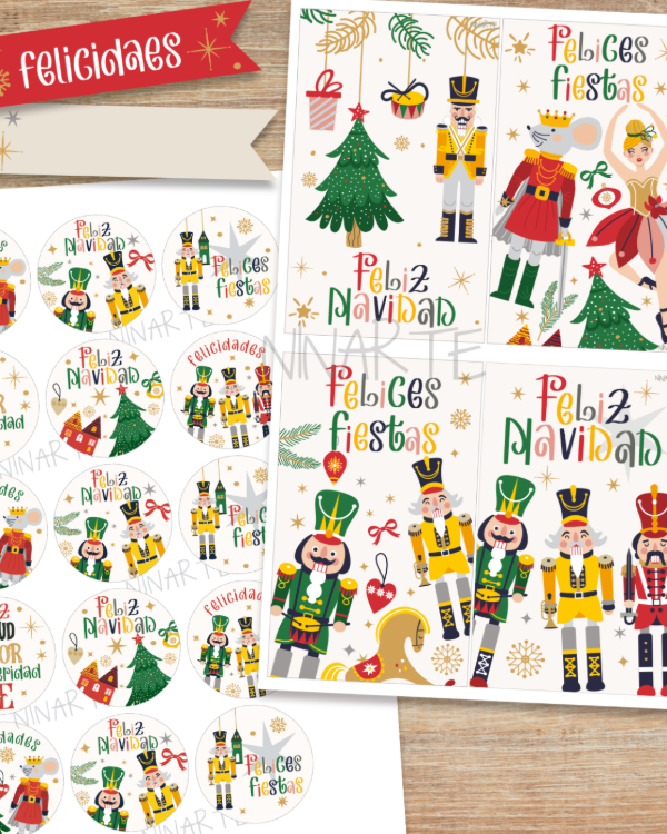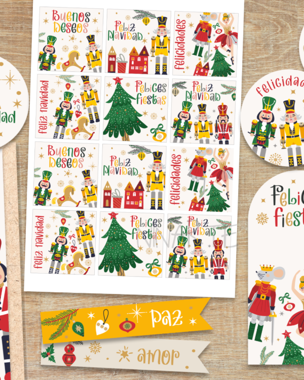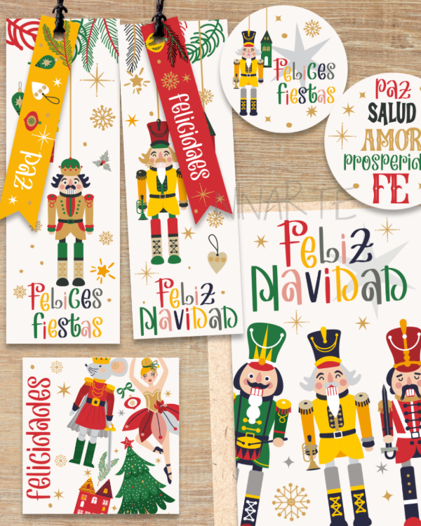 KIT IMPRIMIBLE ETIQUETAS FELIZ NAVIDAD / FELICES FIESTAS CASCANUECES
